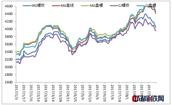 鋼廠快訊:9月25日MG建材掛牌價格下調30元/噸,累計周末跌幅,現螺紋鋼4040元/噸,盤螺4470元/噸,高線4410元/噸。MCJ安徽地區建材掛牌價格螺紋鋼暫穩,盤螺下調30元/噸,累計周末跌幅,現螺紋3950元/噸,盤螺4470元/噸。價格跟蹤圖如下: