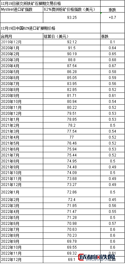 2019年12月19日新交所鐵礦石掉期交易價格