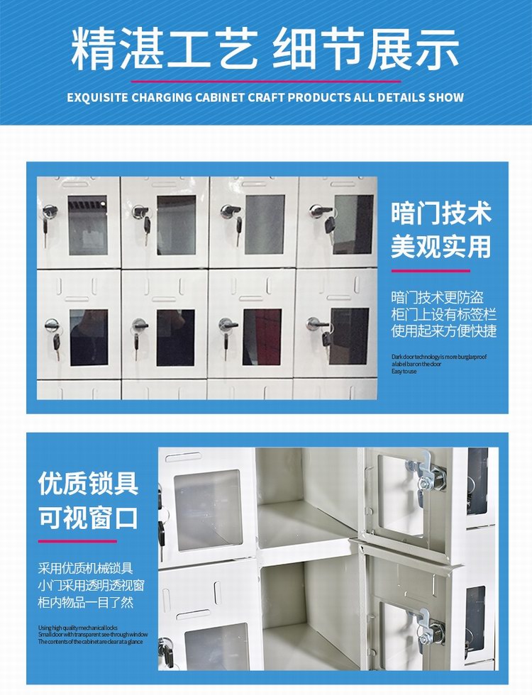 小門設計單獨鎖具,單柜單開,可實現一人一鎖;上方設計標簽卡槽,便于粘貼姓名銘牌等信息,方便識別與管理,右下部設計透明亞克力觀察窗,便于觀察手機存放情況;內部采用暗門折邊設計,有效防止刮手。